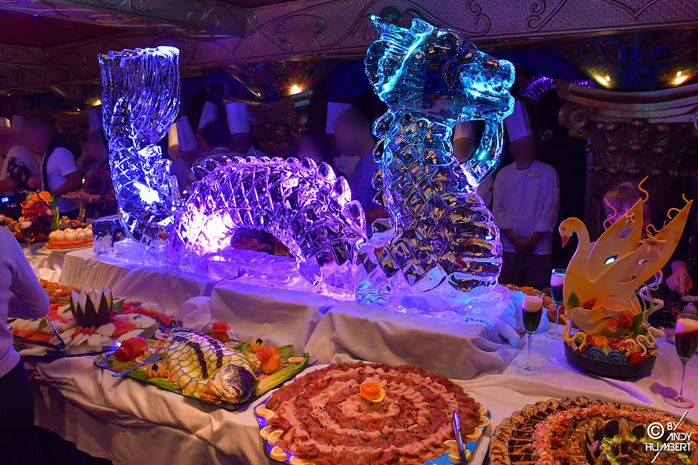Particularité des croisières labellisées Costa Voyages (croisières de plus de 10 nuits), le retour du traditionnel buffet de minuit, magnifiquement présenté avec sculptures de glace et de fruits dans le Grand Bar Conte di Savoia 1932.