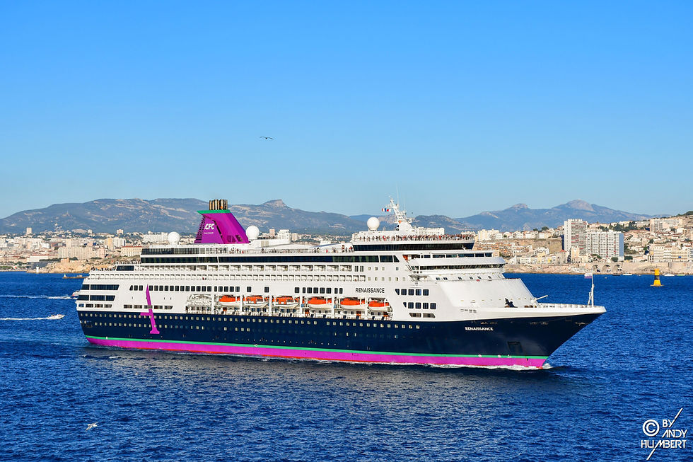 Le plus grand paquebot français, Renaissance de Compagnie Française de Croisières, approche après avoir quitté le port de Marseille pour passer entre les îles du Frioul et If.